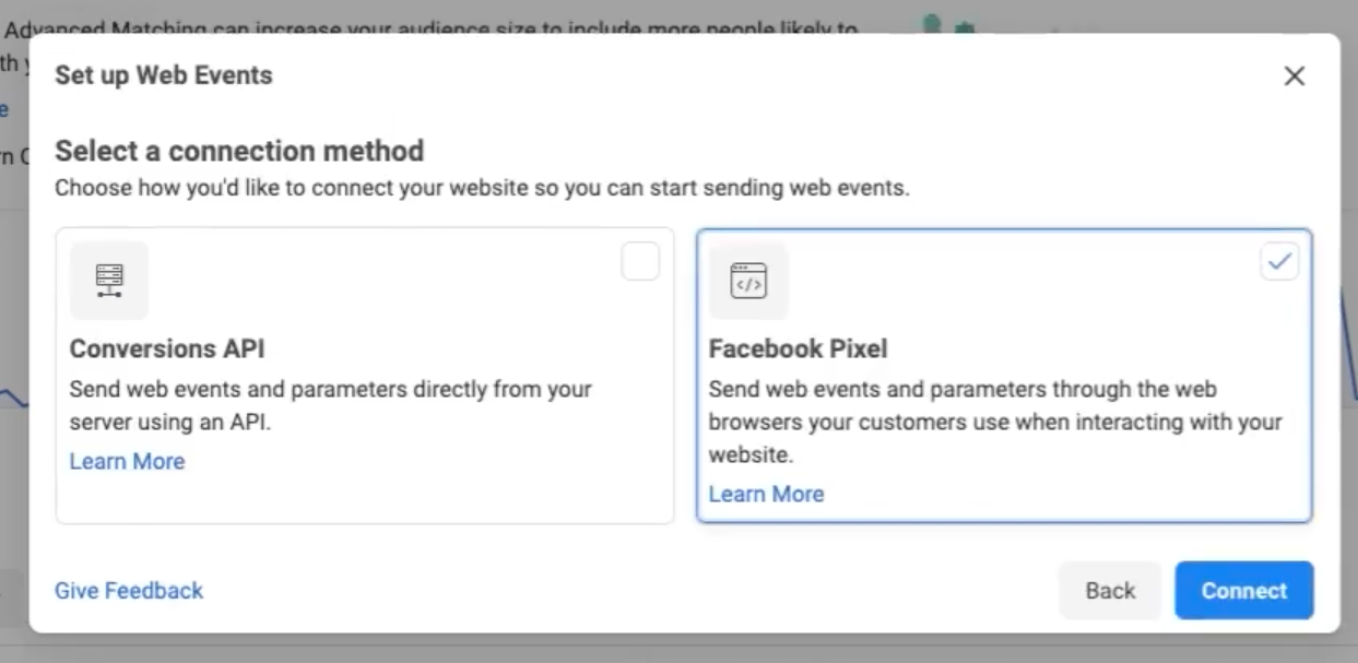 In the Set up Web Events window, select Facebook Pixel and click Connect: